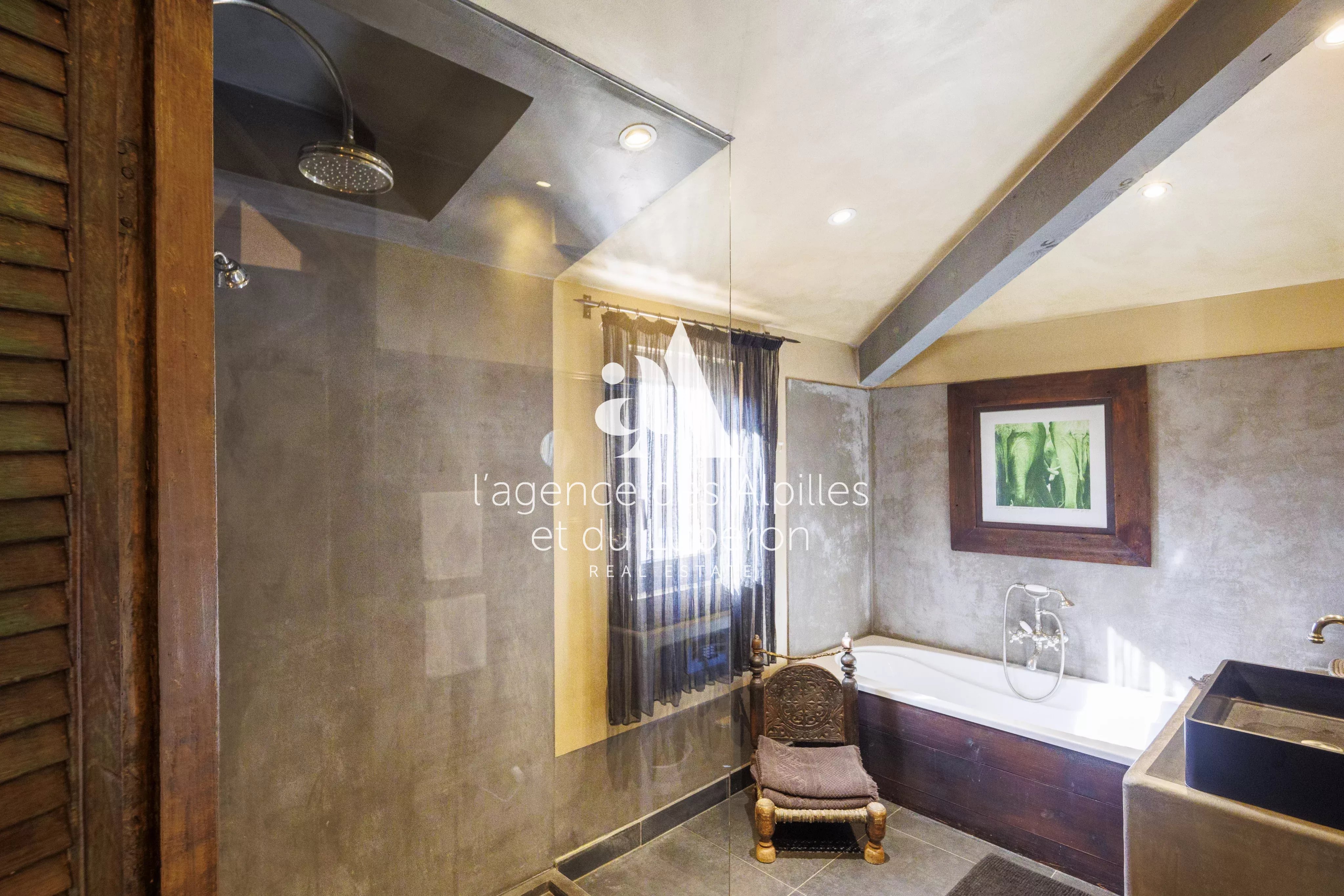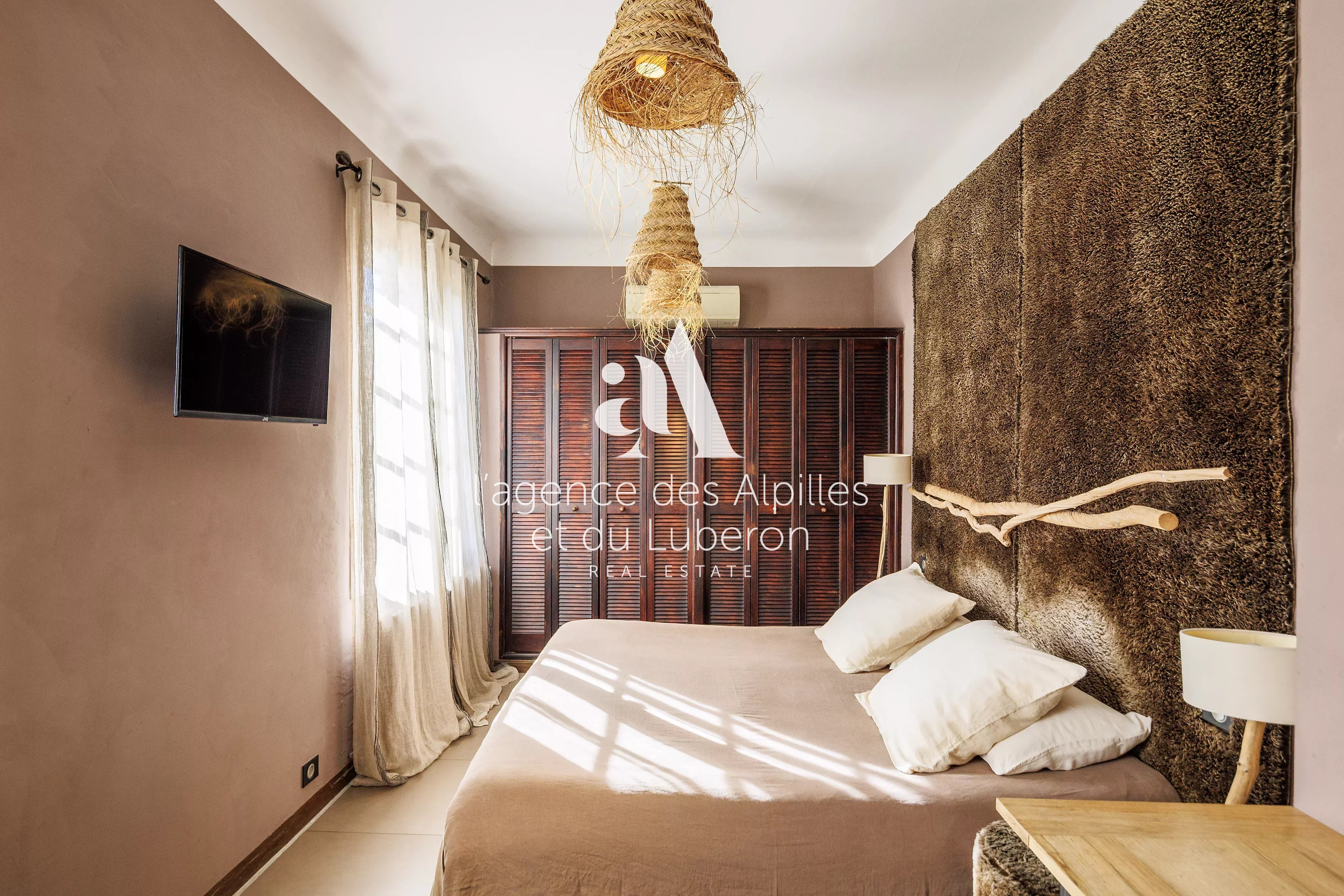 Completely enclosed by walls and protected from any nuisance, the garden is divided into several dedicated areas: outdoor swimming pool, rest area under a covered terrace, shaded petanque court, and a convivial dining area under a flowery, fragrant trellis.