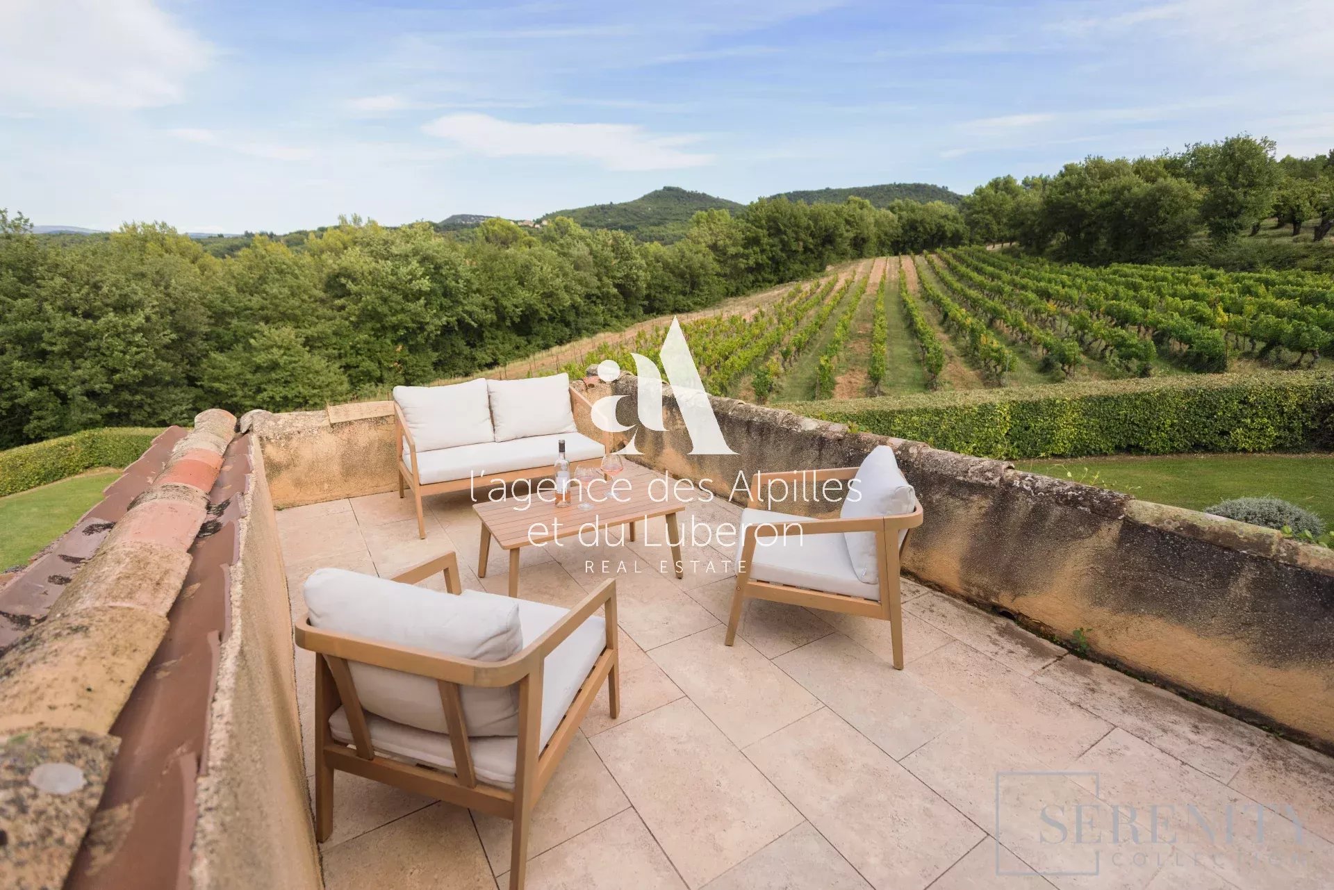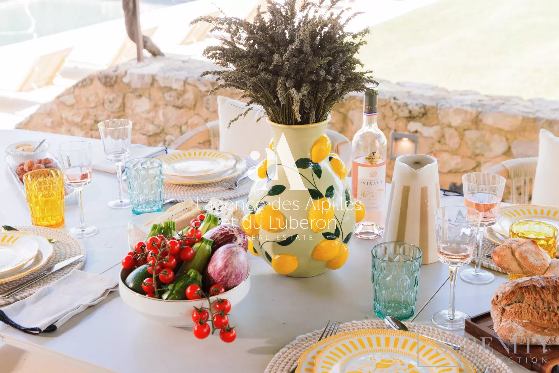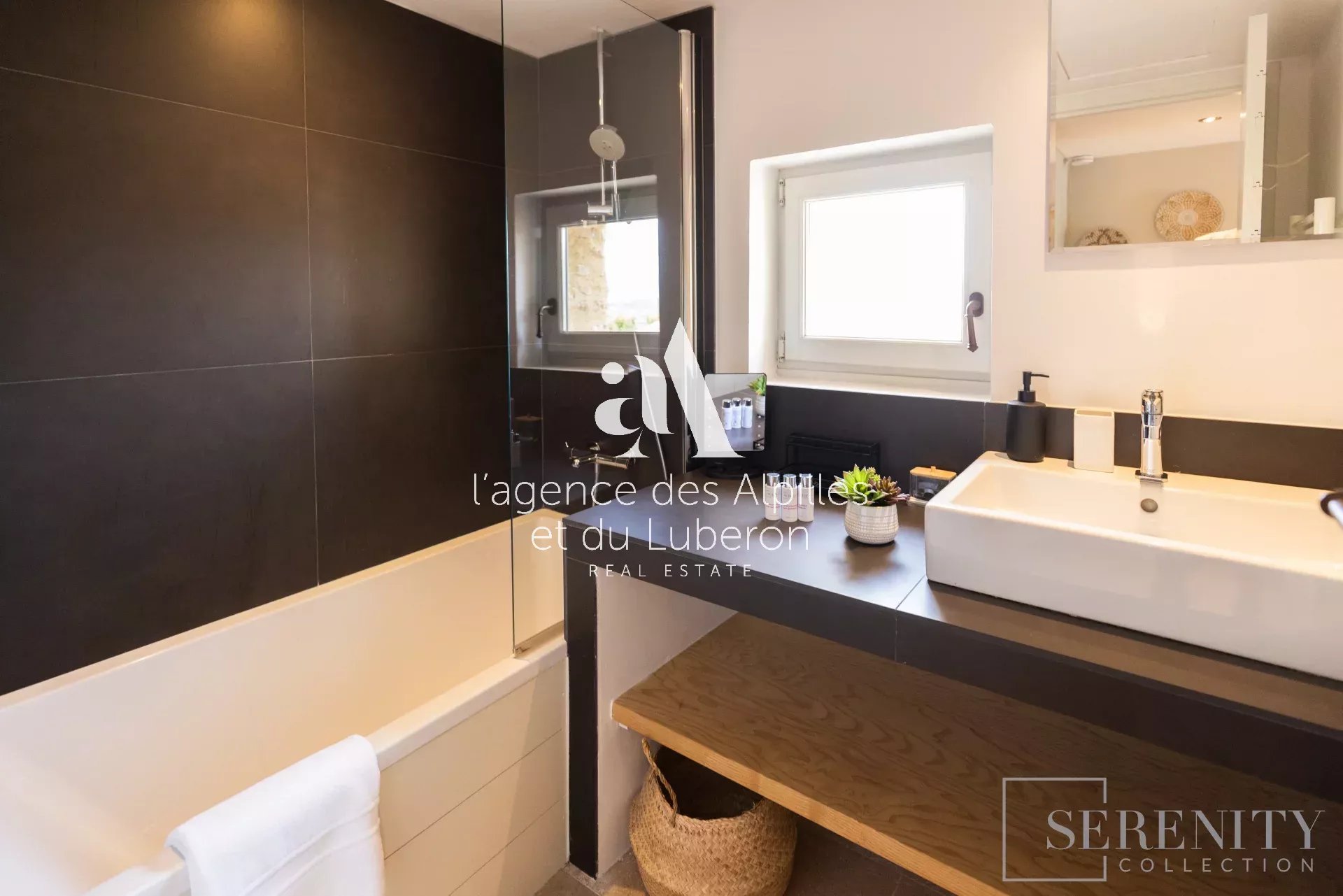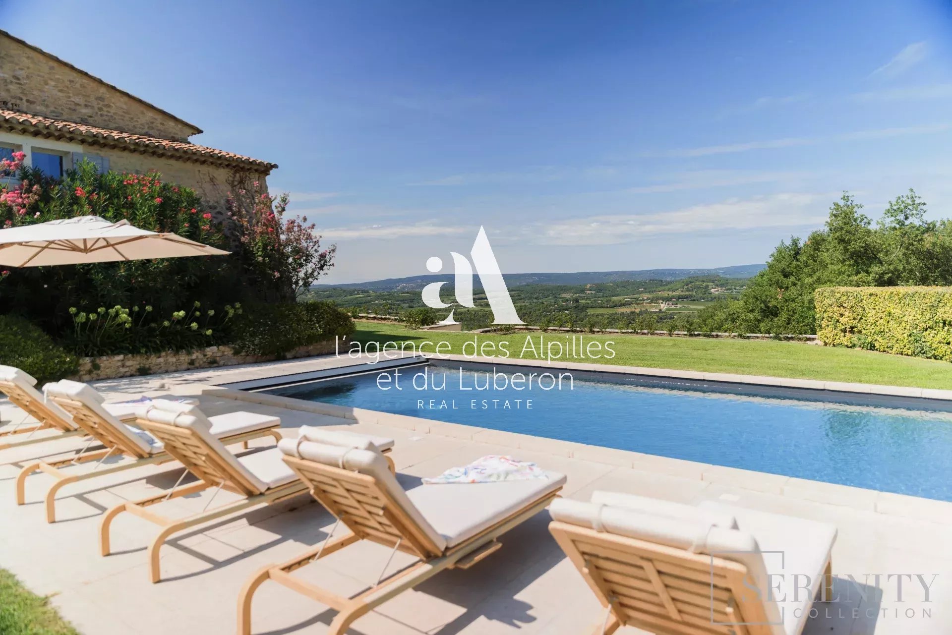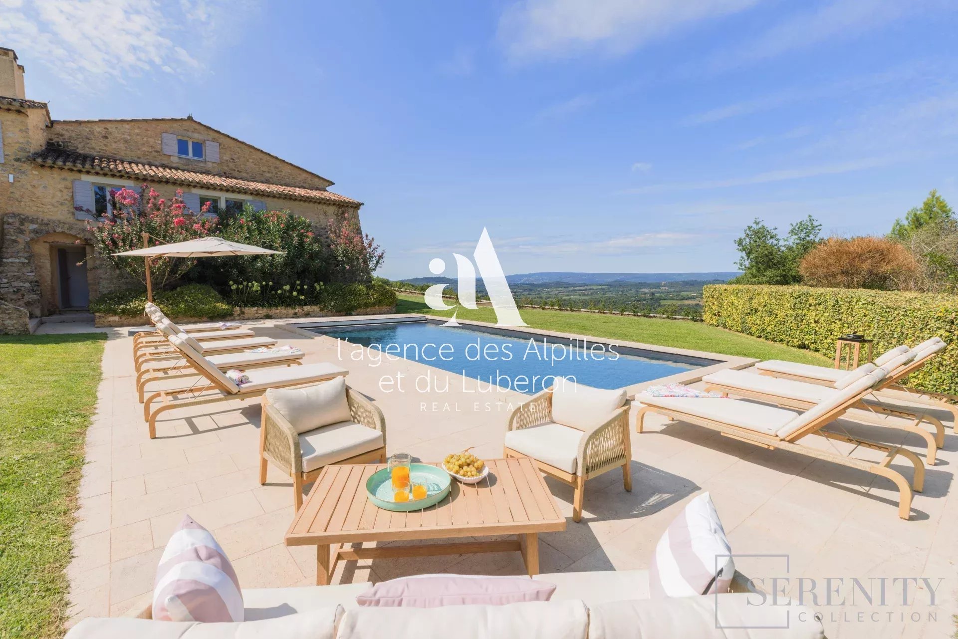 Une piscine chauffée de 7 x 11 mètres s’étire face aux paysages du Luberon, offrant un panorama à couper le souffle. Le coin piscine, aménagé avec élégance, permet de profiter des longues journées d’été entre baignades et farniente.