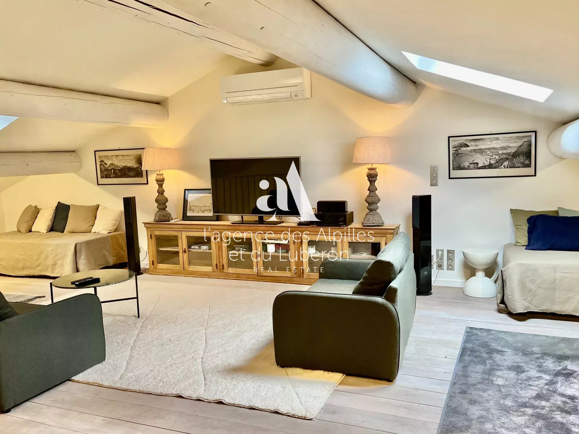 Au-dessus du séjour une mezzanine abrite un coin TV et lecture.