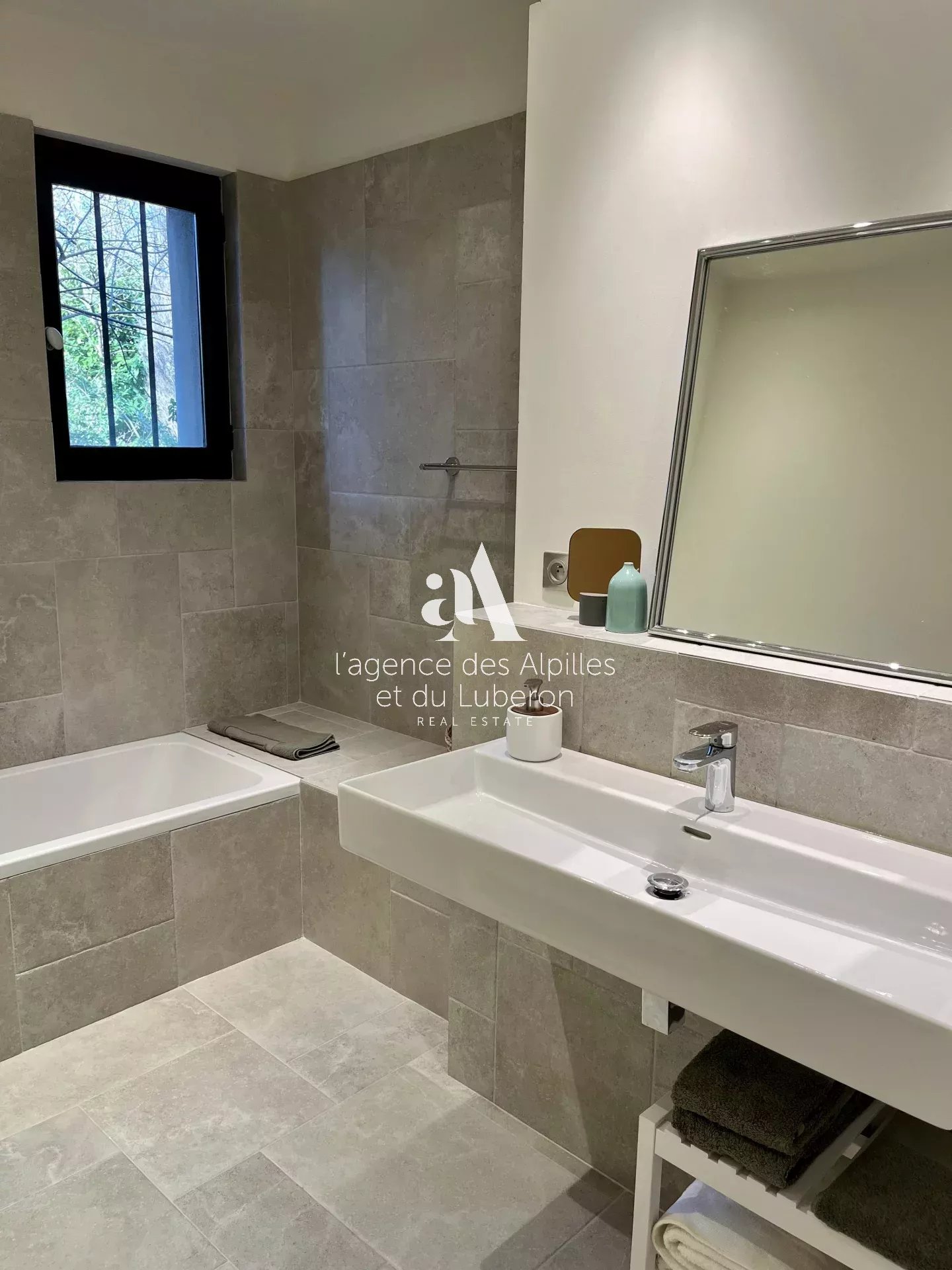 Chambre 1/Master : un lit double king-size (180x200) ou deux lits simples, vue sur le jardin et salle de bain attenante avec douche, double-vasques et WC.