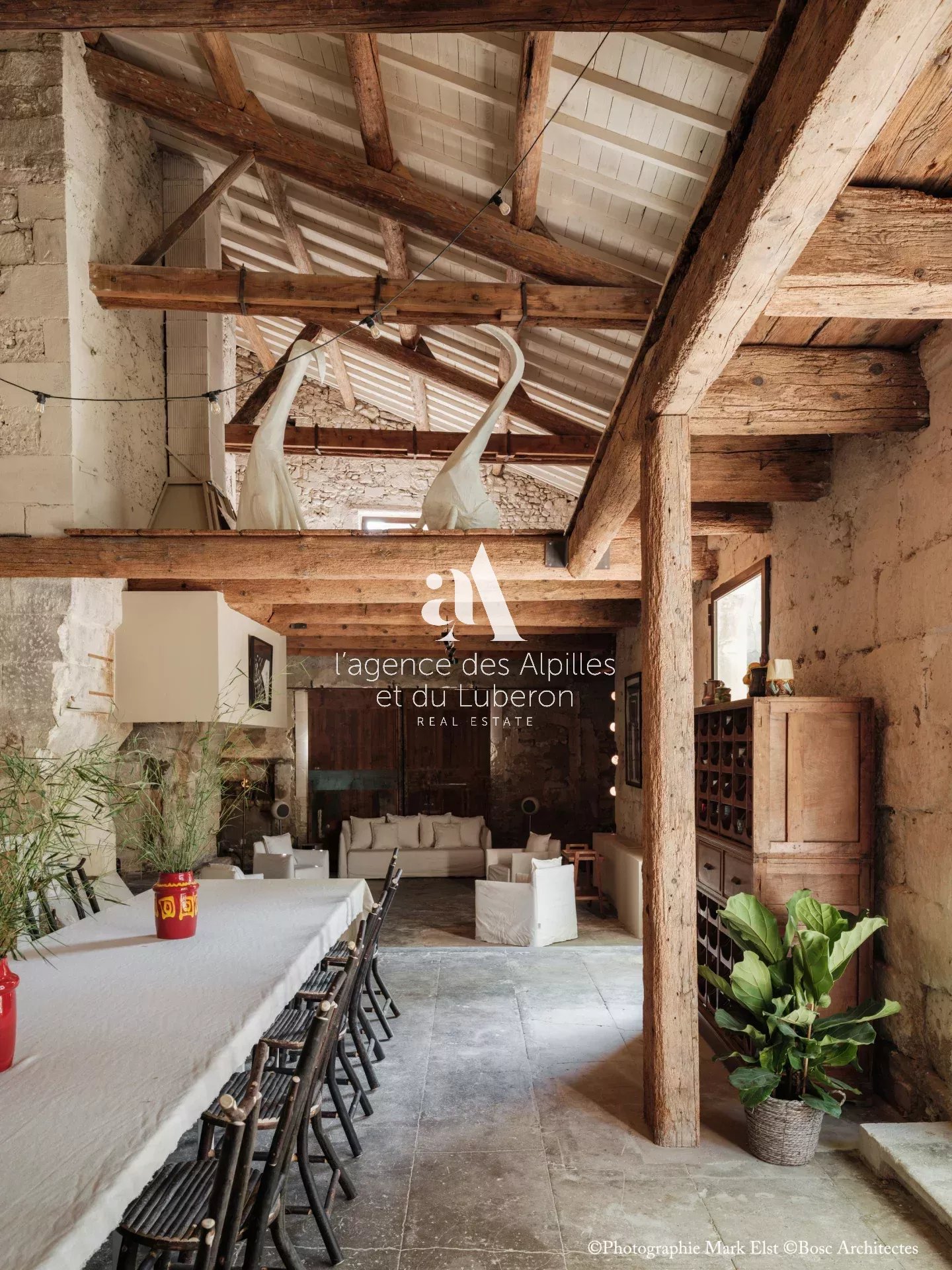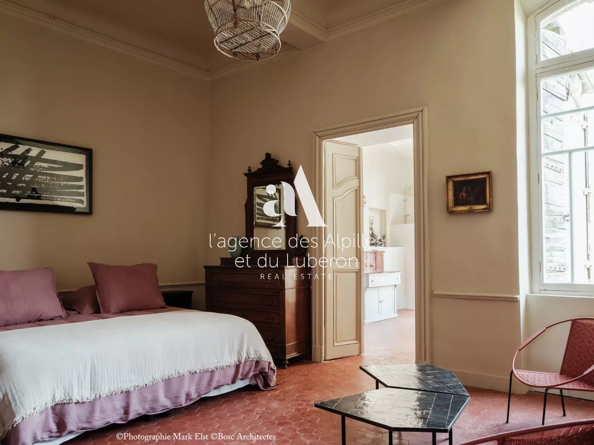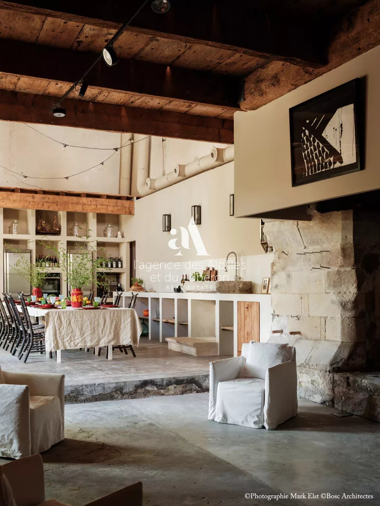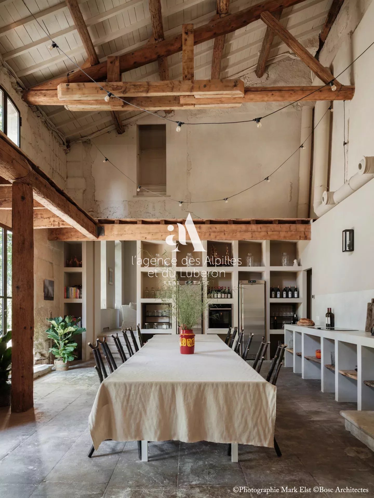 La bastide se compose de 8 chambres, 7 salles de bains, 3 salons dont un salon billard, ainsi qu'une cuisine exceptionnelle en double hauteur pour faire des banquets avec une partie cheminée dans laquelle il est possible de cuisiner au feu.