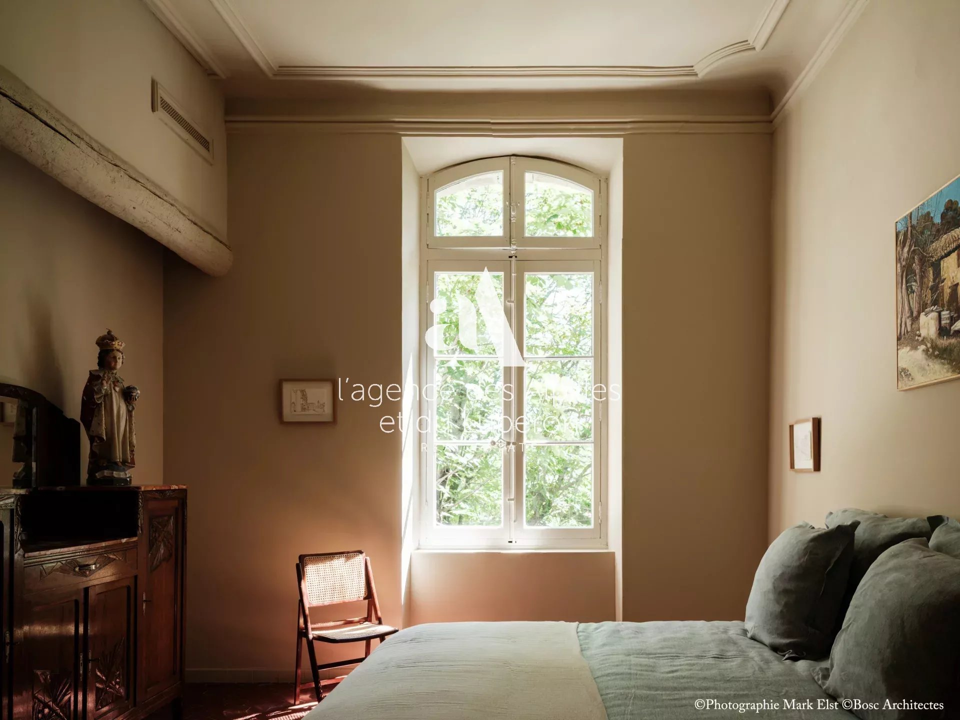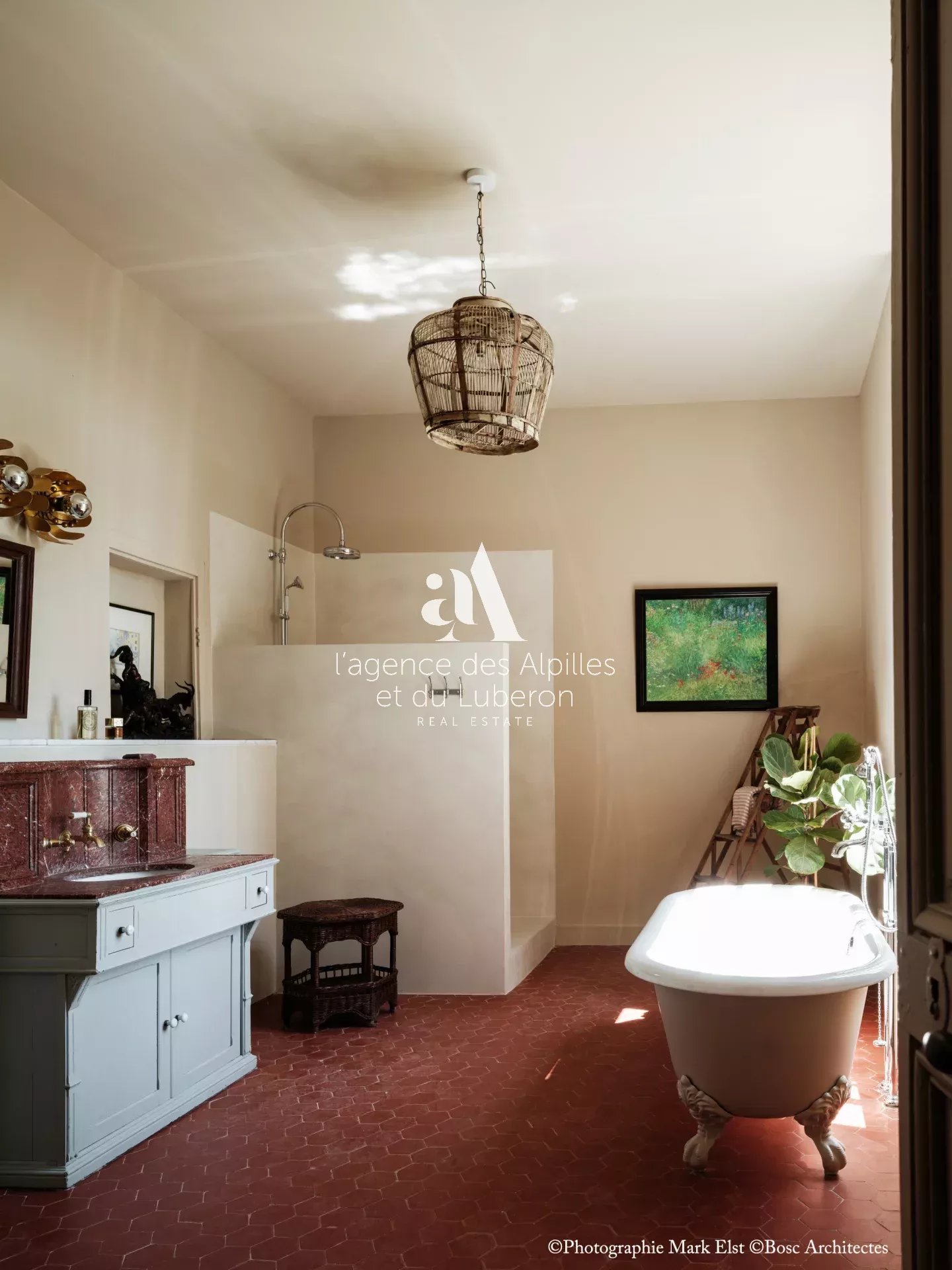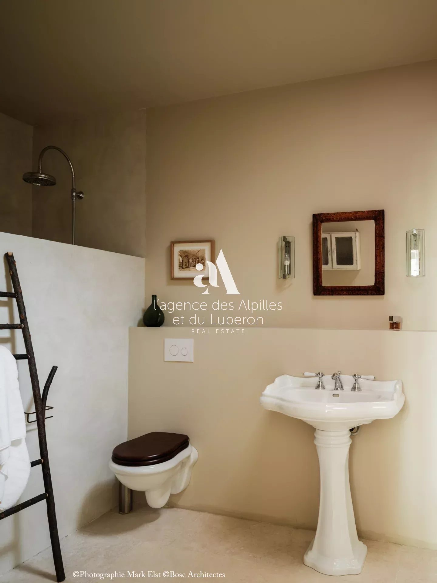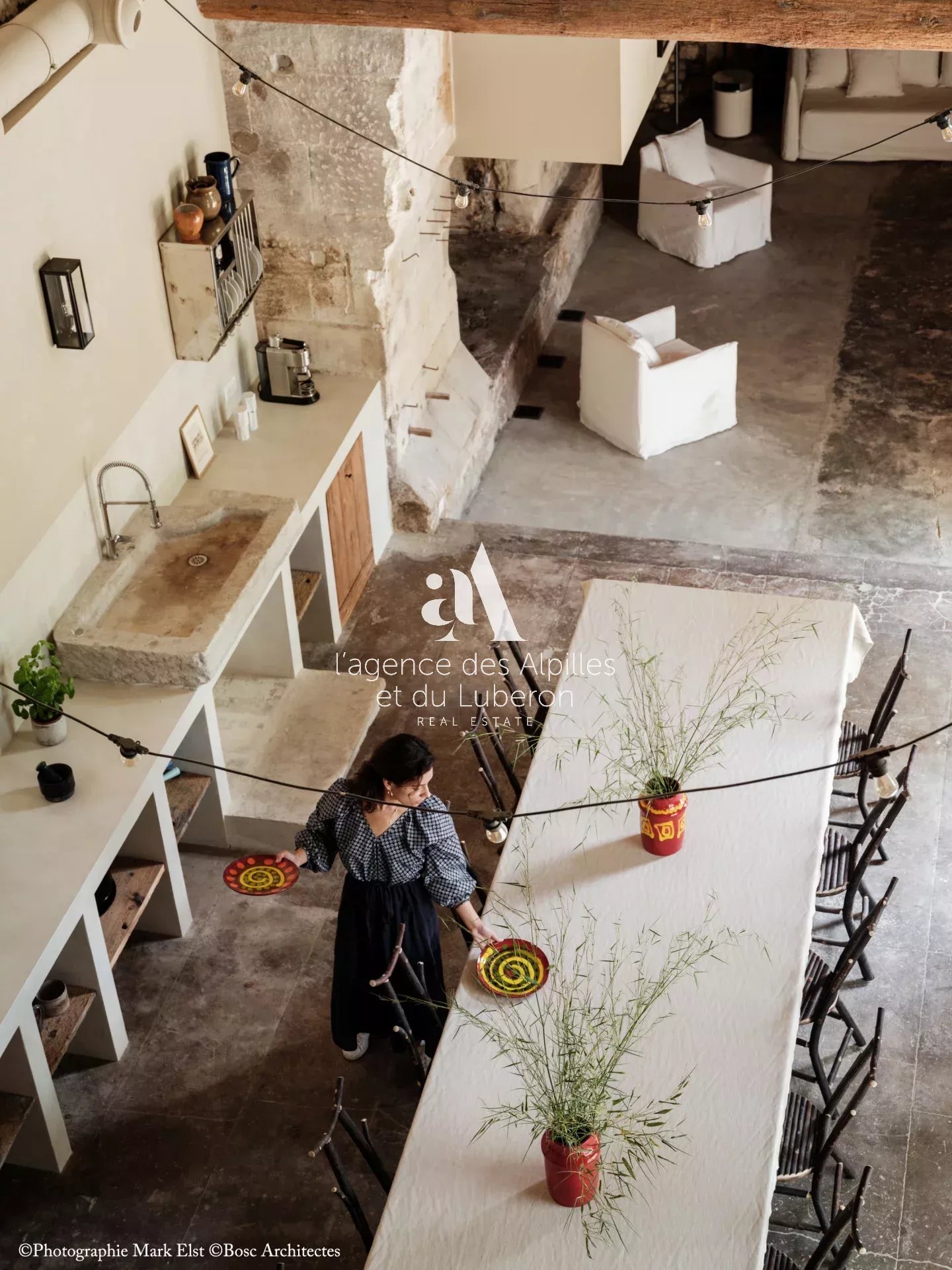 La bastide se compose de 8 chambres, 7 salles de bains, 3 salons dont un salon billard, ainsi qu'une cuisine exceptionnelle en double hauteur pour faire des banquets avec une partie cheminée dans laquelle il est possible de cuisiner au feu.