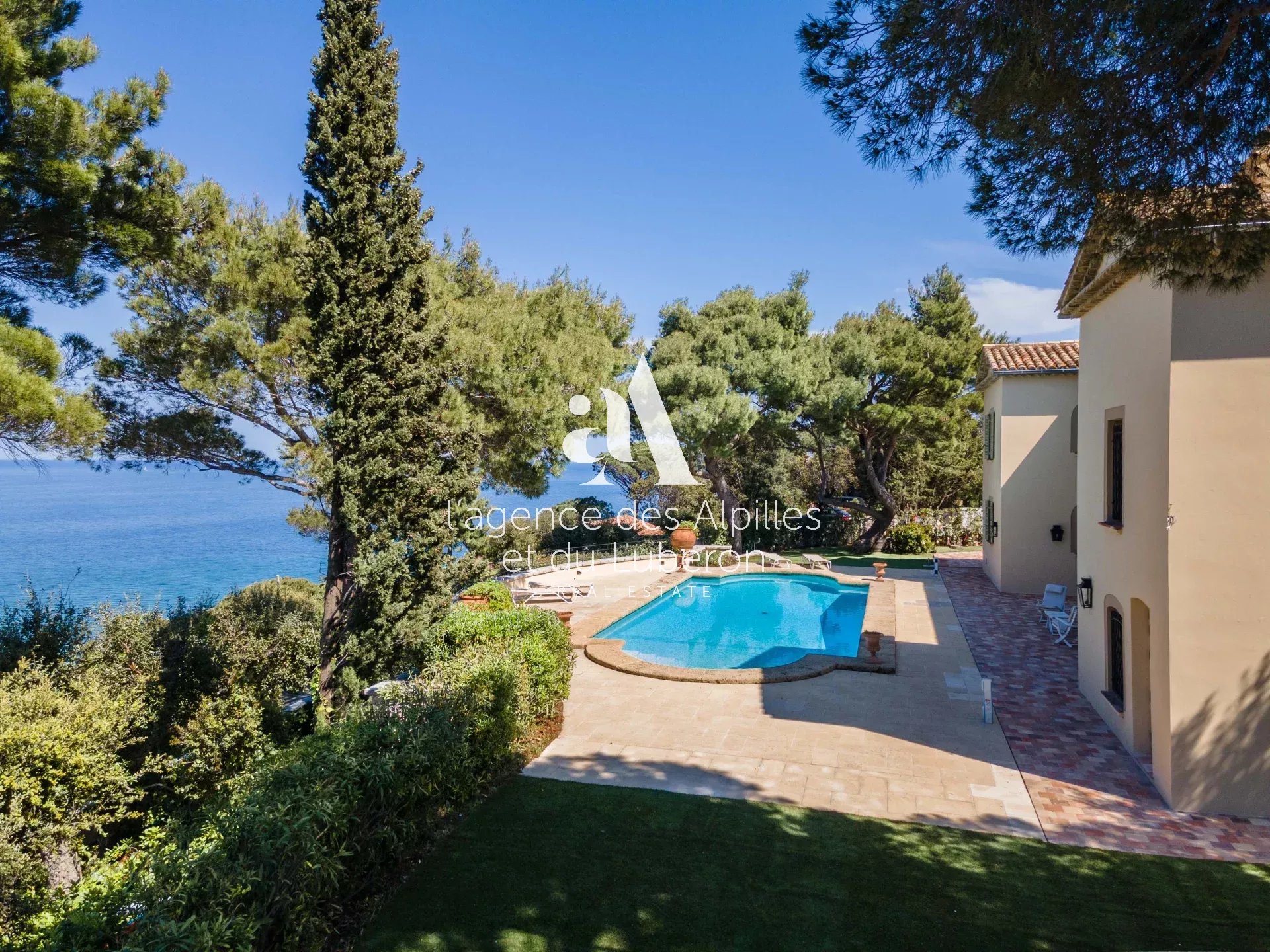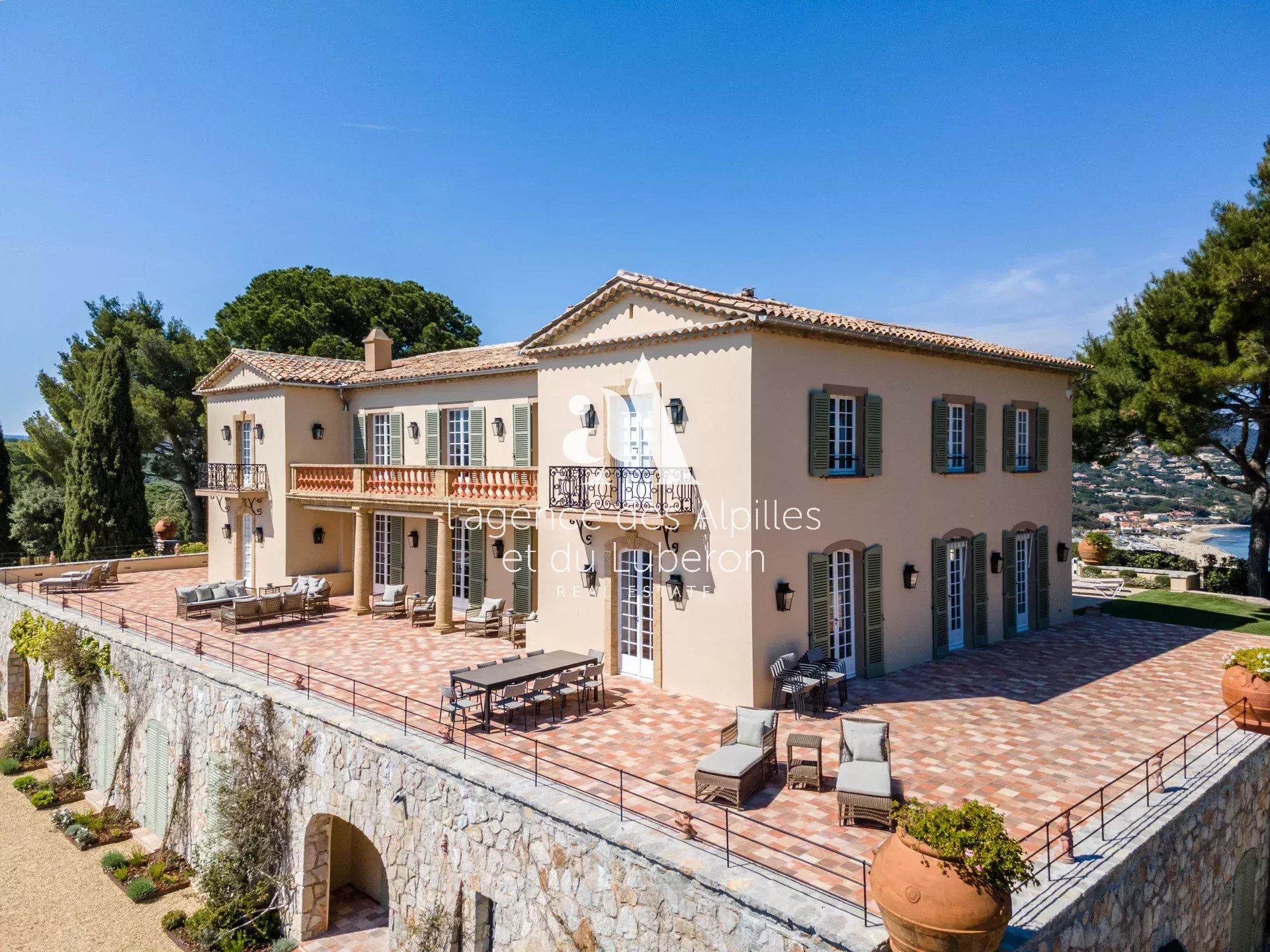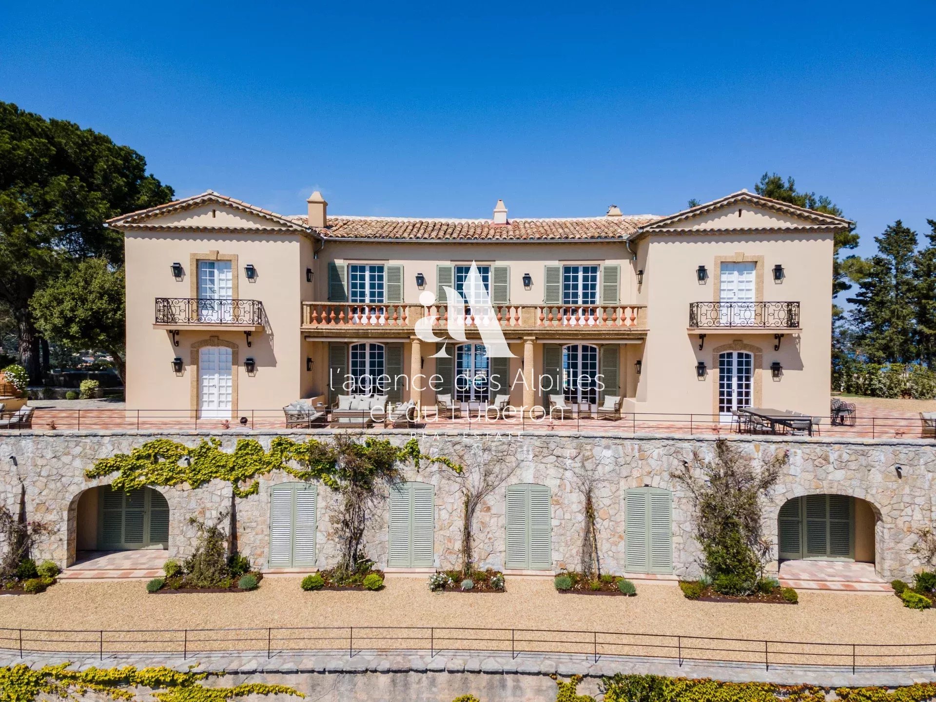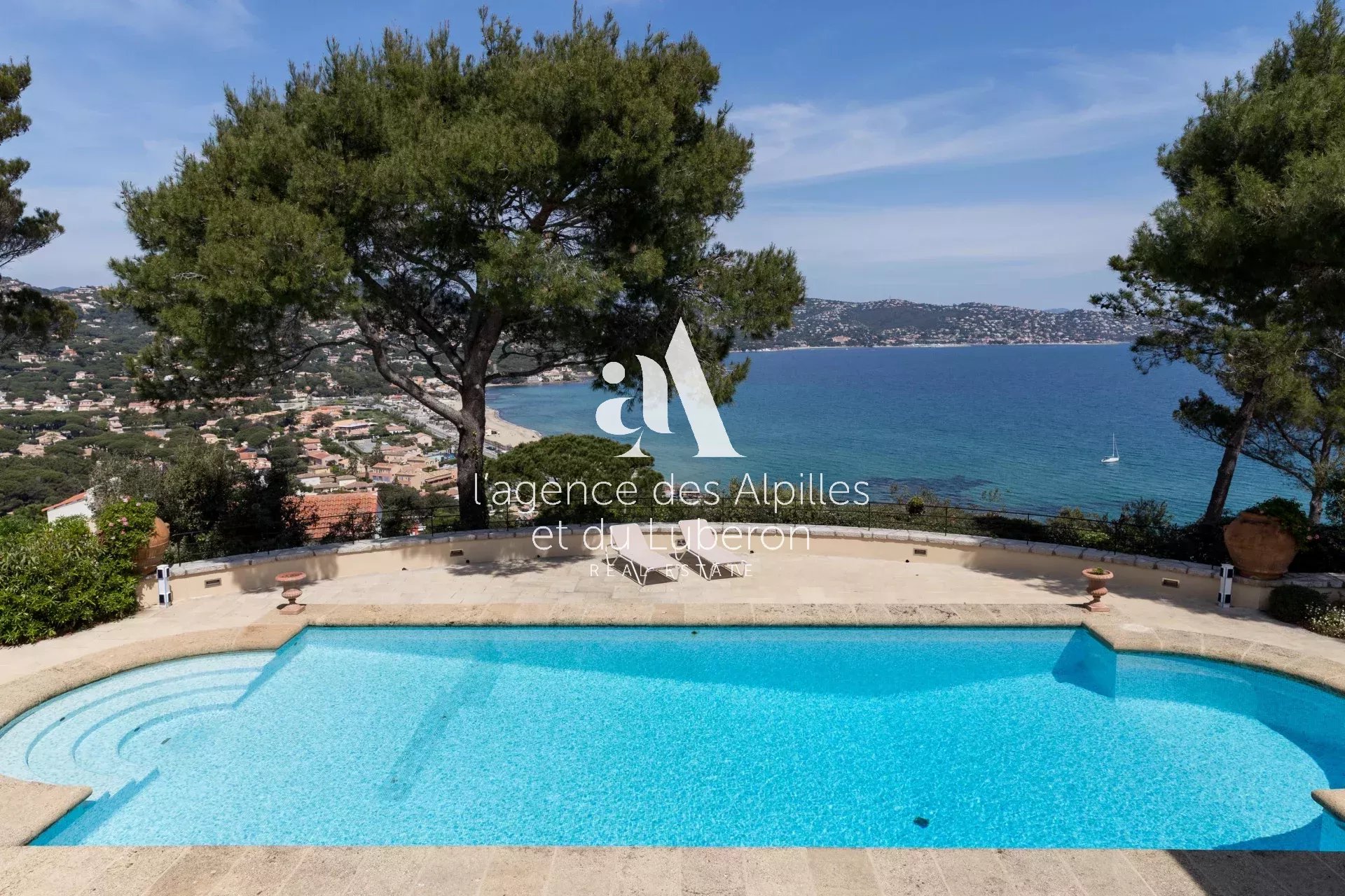 Villa Toscane, vue mer imprenable pour cette propriété exceptionnelle, idéalement située à quelques minutes en voiture de la plage et 20 minutes de Saint-Tropez.