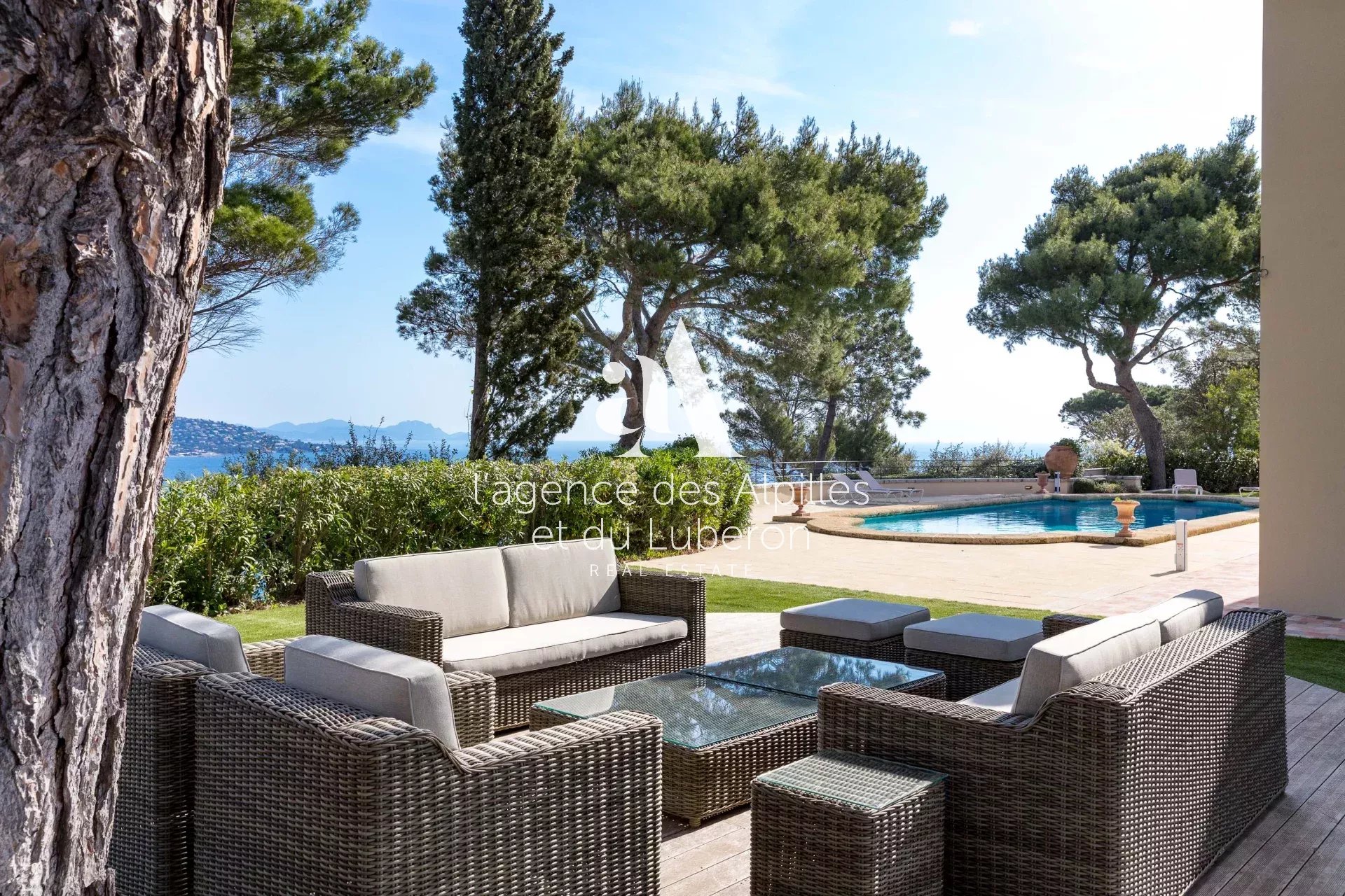 Plusieurs espaces de détente avec salon de jardin, vue Saint-Tropez et la mer.